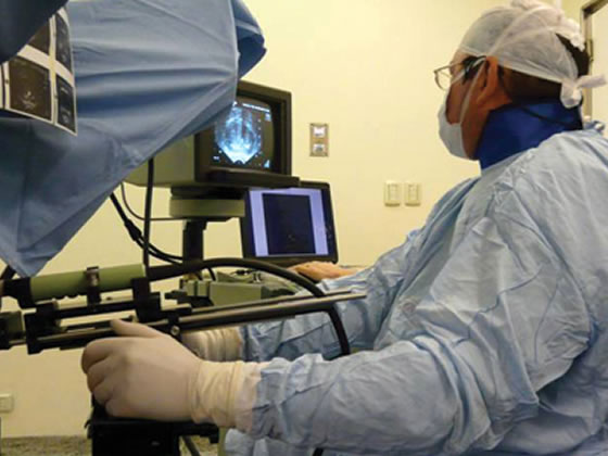 Procedimiento ambulatorio, que se realiza con el paciente despierto utilizando la estructura ósea del cráneo para fijar un marco esterotáxico de referencia.